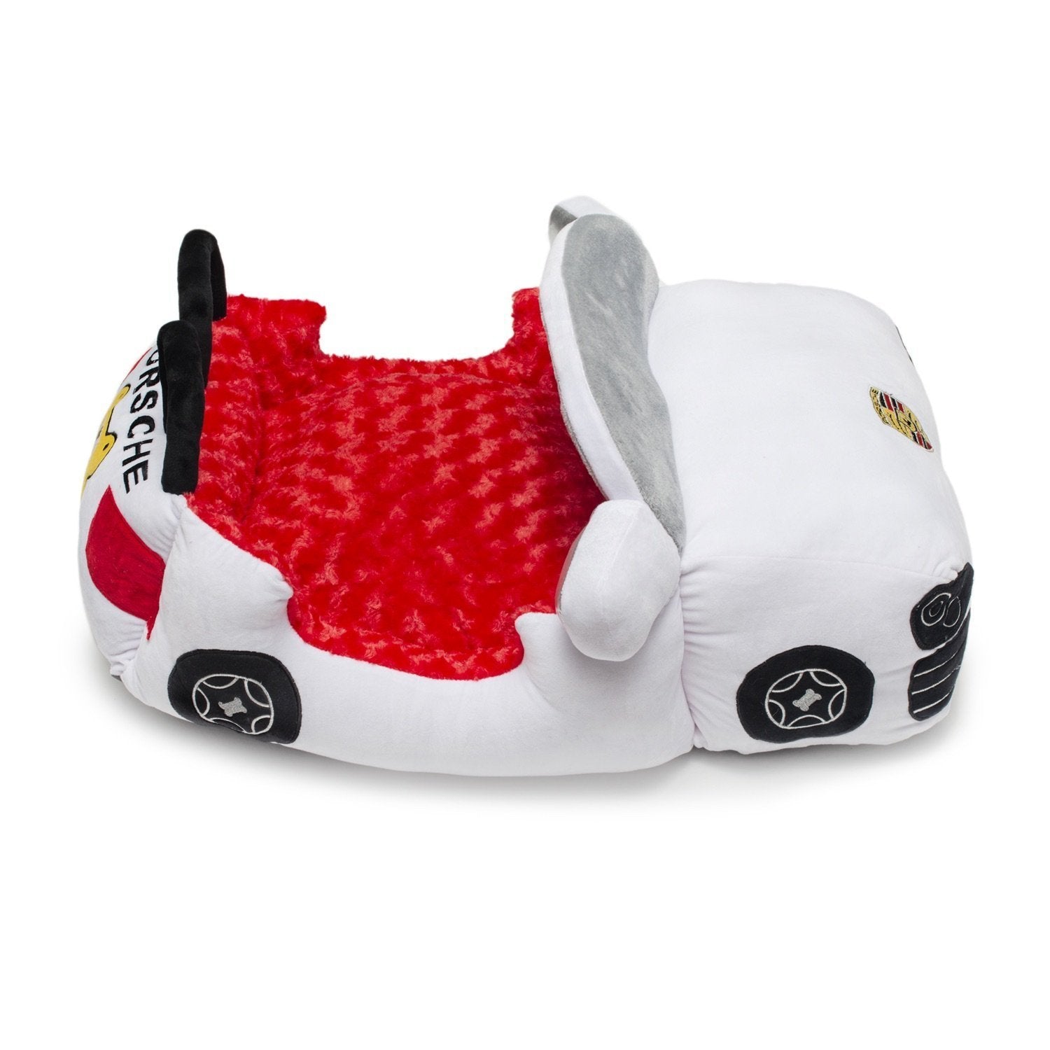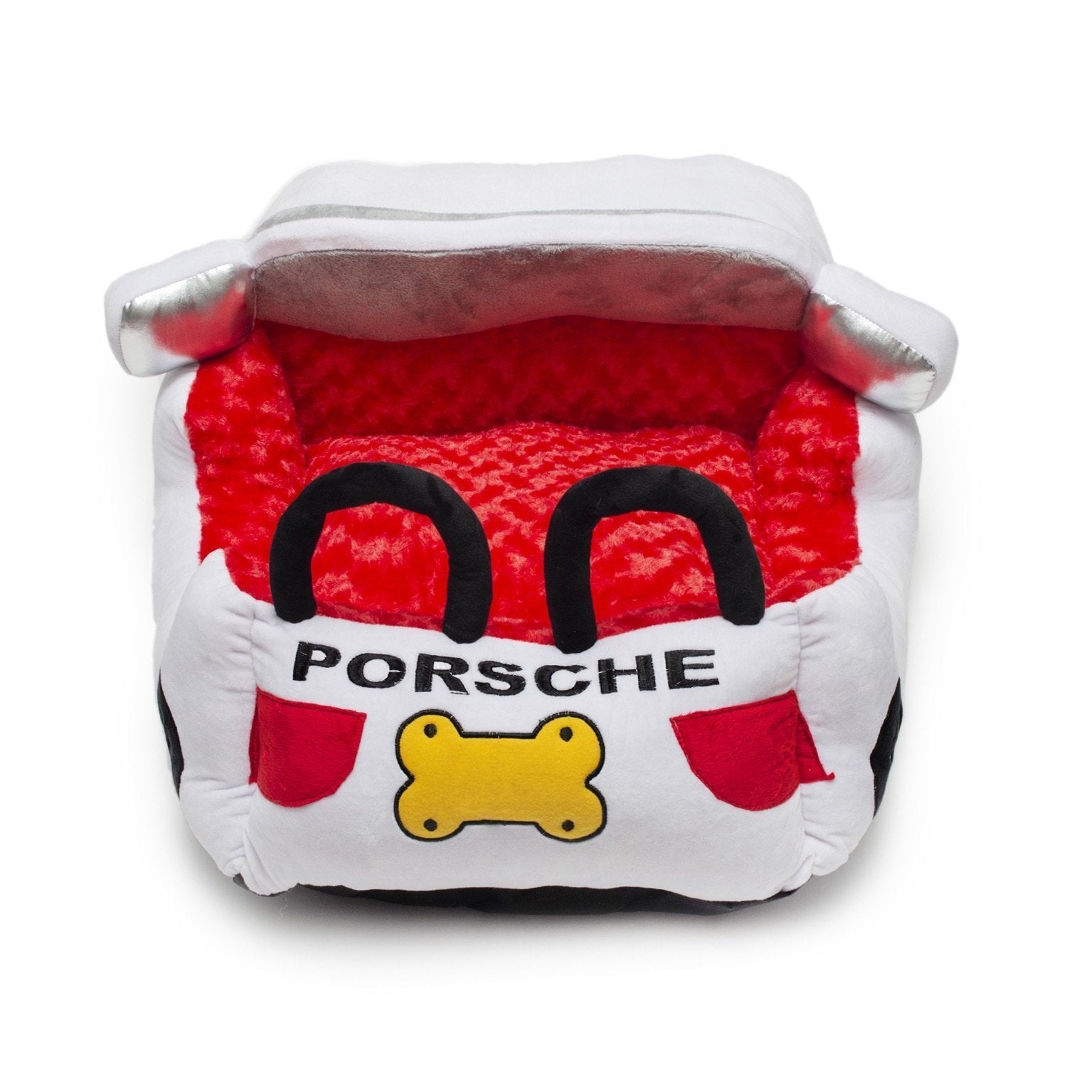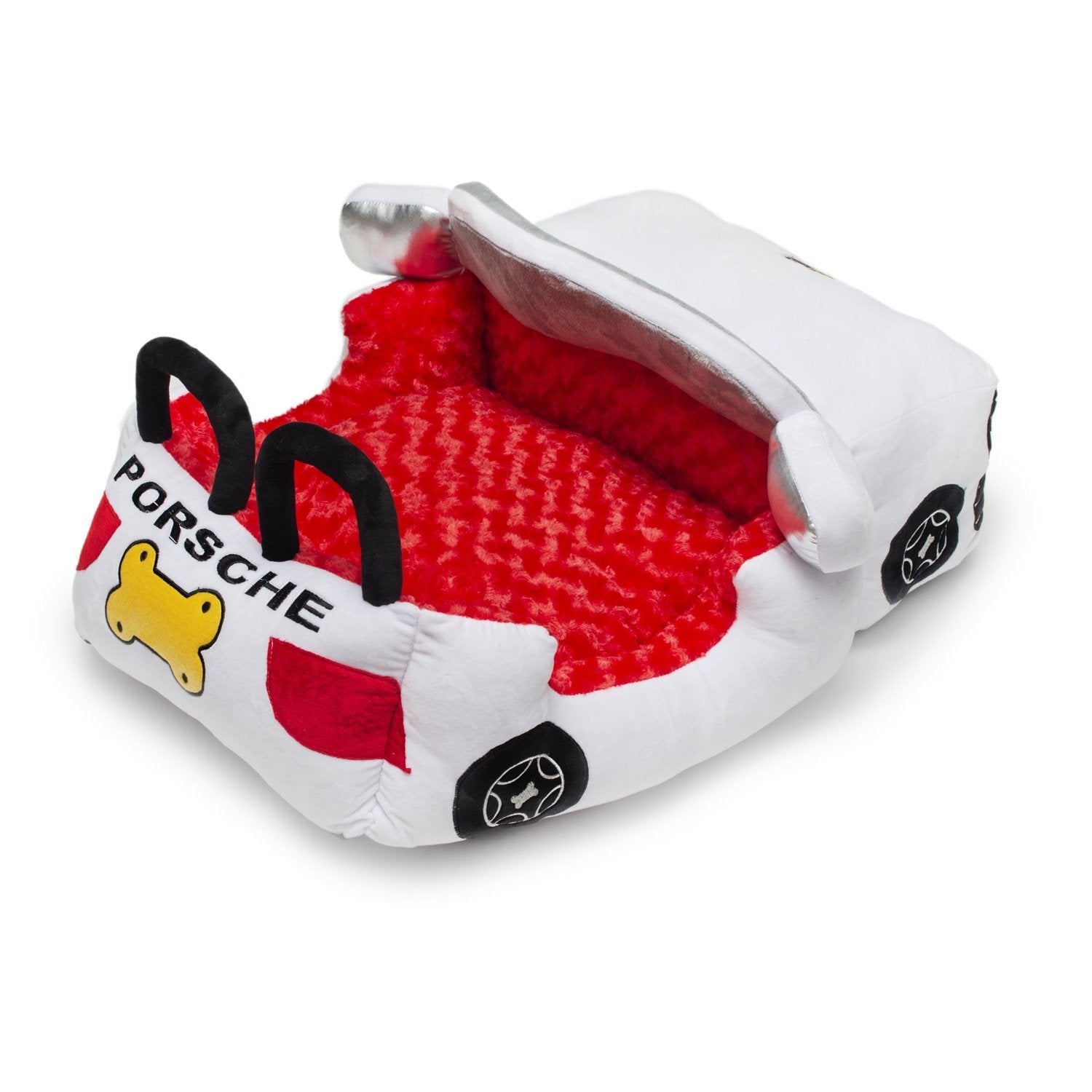 Each pet bed is carefully handcrafted to resemble a high-performance exotic car, complete with intricate stitching, bold headlights, and a sleek white exterior. The plush red interior offers your pet a spacious and cozy place to relax (18" x 22"), making it perfect for stylish naps or adorable photo ops!