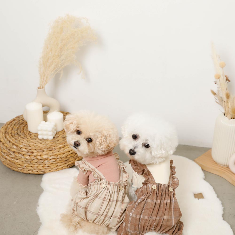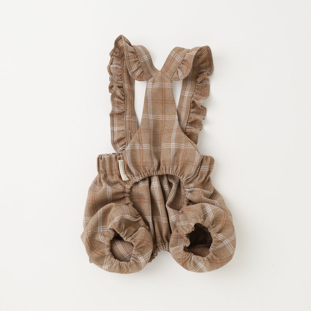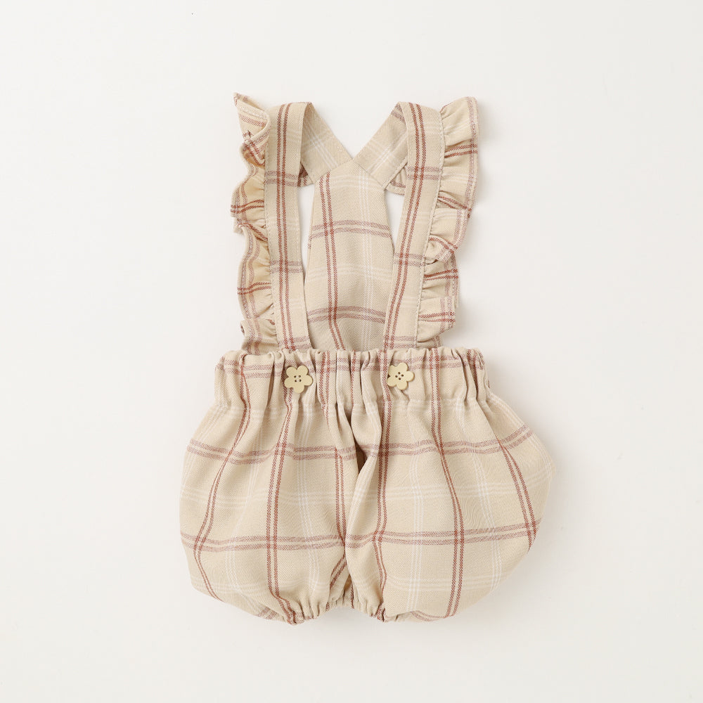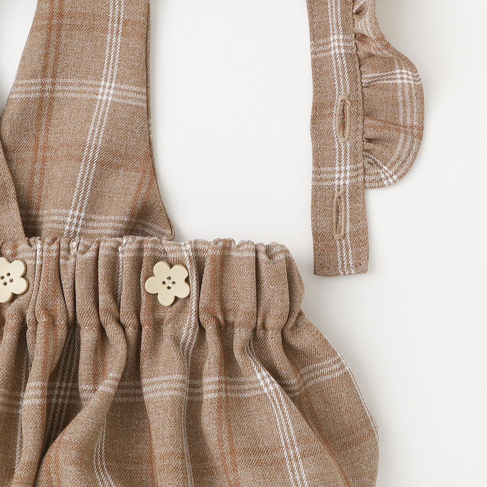 It is a natural check pattern fabric rompers with a flower -shaped button.